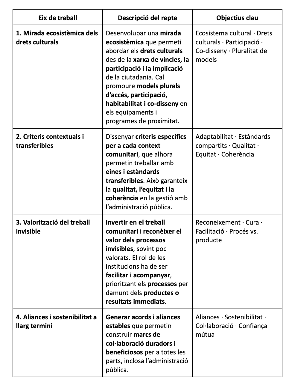 Las conclusiones del taller celebrado en el marco de la Trobada Anual de Formació del personal i equips (22 de octubre de 2025) ofrecen una mirada profunda sobre el presente y el futuro de la cultura comunitaria y los derechos culturales en los equipamientos de proximidad. A partir de los análisis grupales, la puesta en común y el debate final, emergieron una serie de reflexiones que permiten entender tanto los retos como las potencialidades de este ámbito de trabajo.